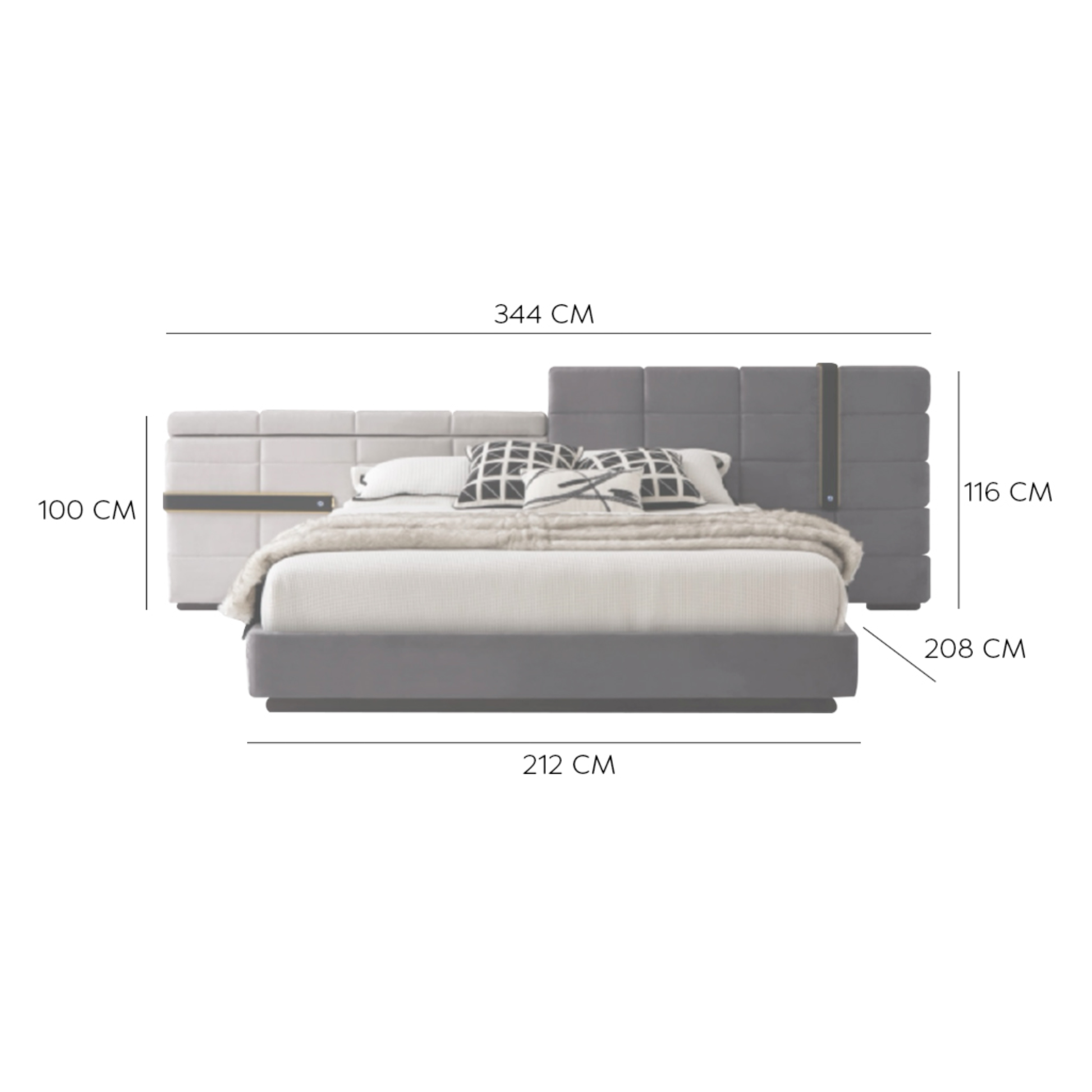 Cama tamaño King en combinación de materiales y colores, su diseño asimétrico genera un juego visual que la hace una pieza escultórica en cualquier espacio. Además, sus correas laterales aportan luz al copete para hacerlo destacar dentro de la habitación.