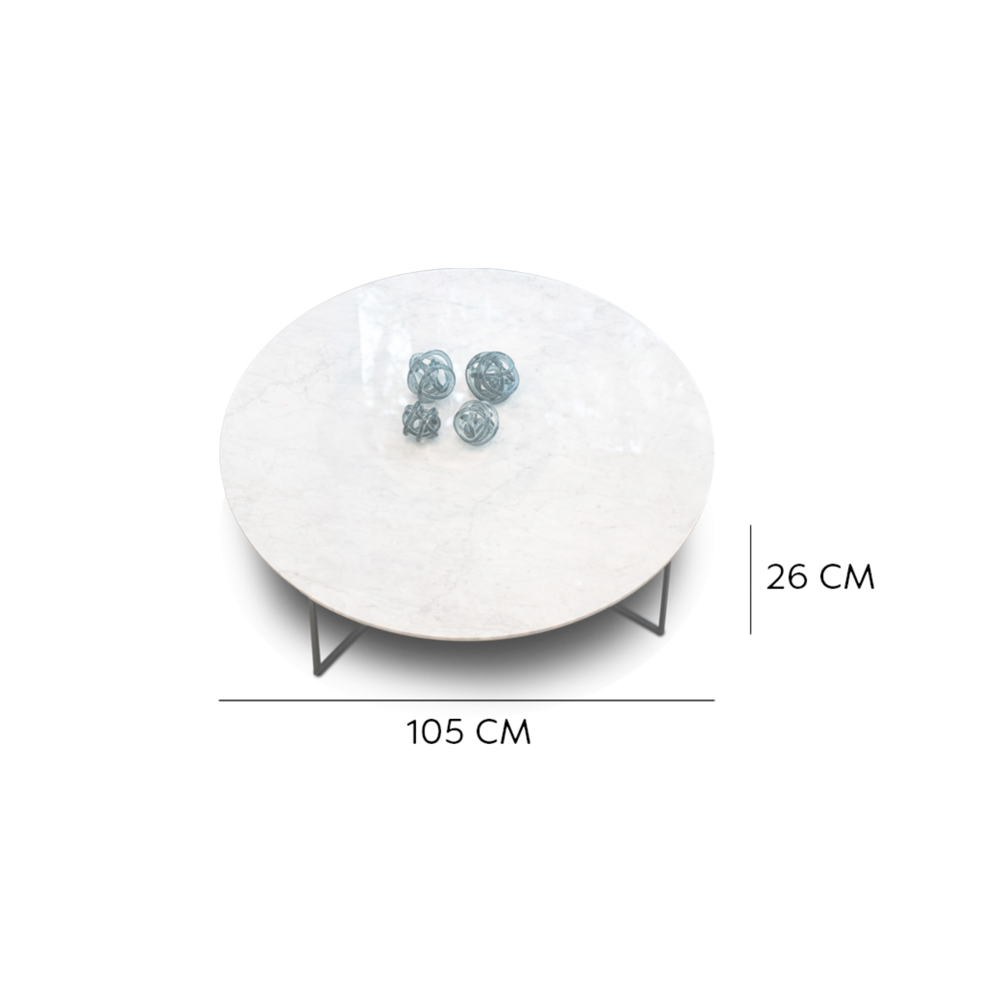 Mesa circular con tope de mármol delicado y sobrio, pero con una reflectividad que brinda esa sensación de lujo que vemos en las piedras preciosas.