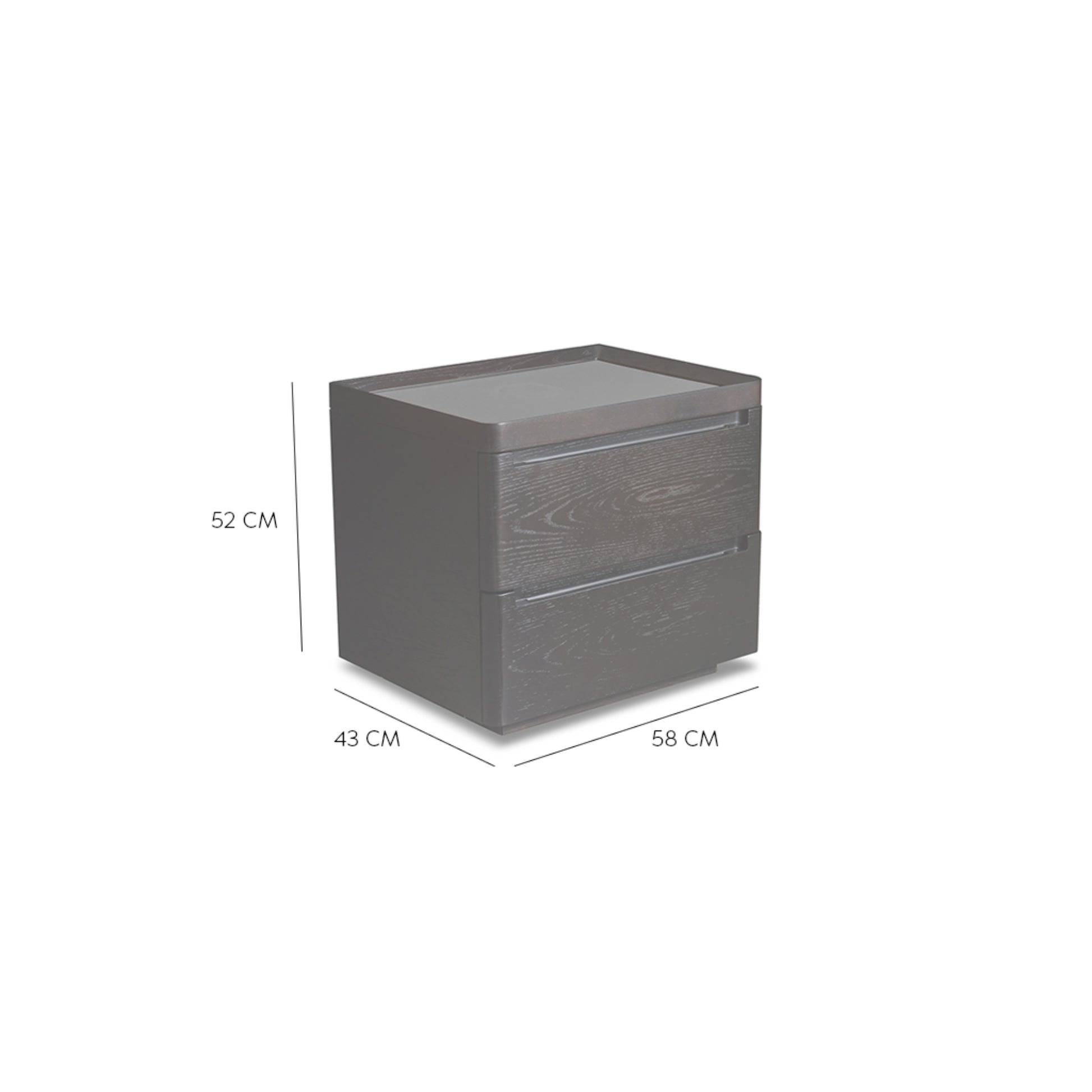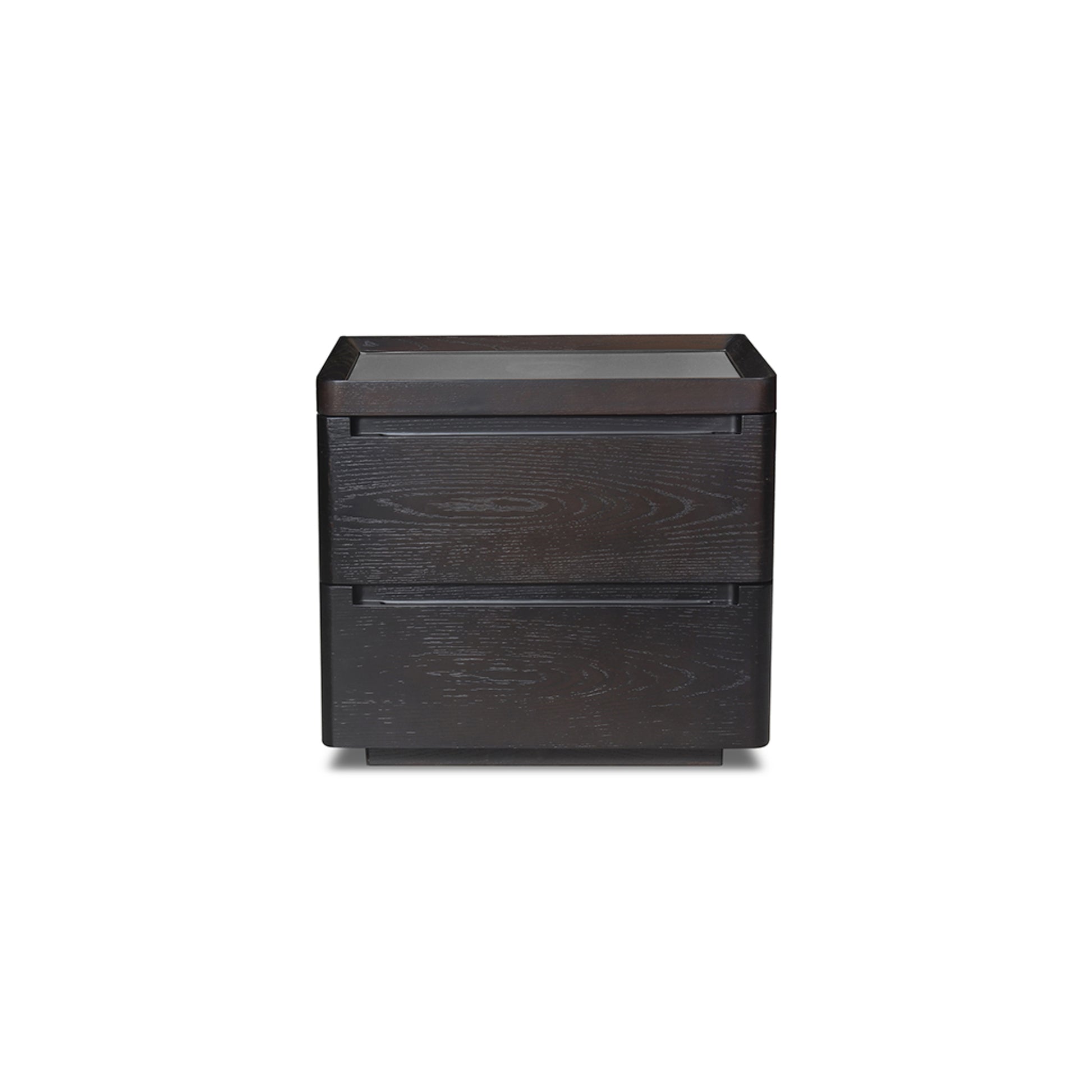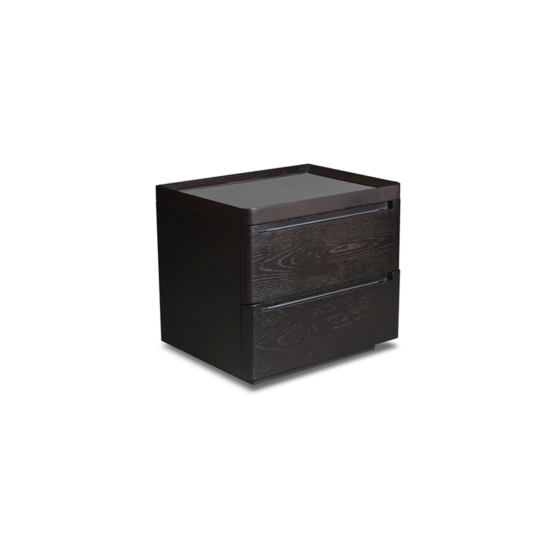 Mesa de noche en madera con dos gavetas y tope de cuero.