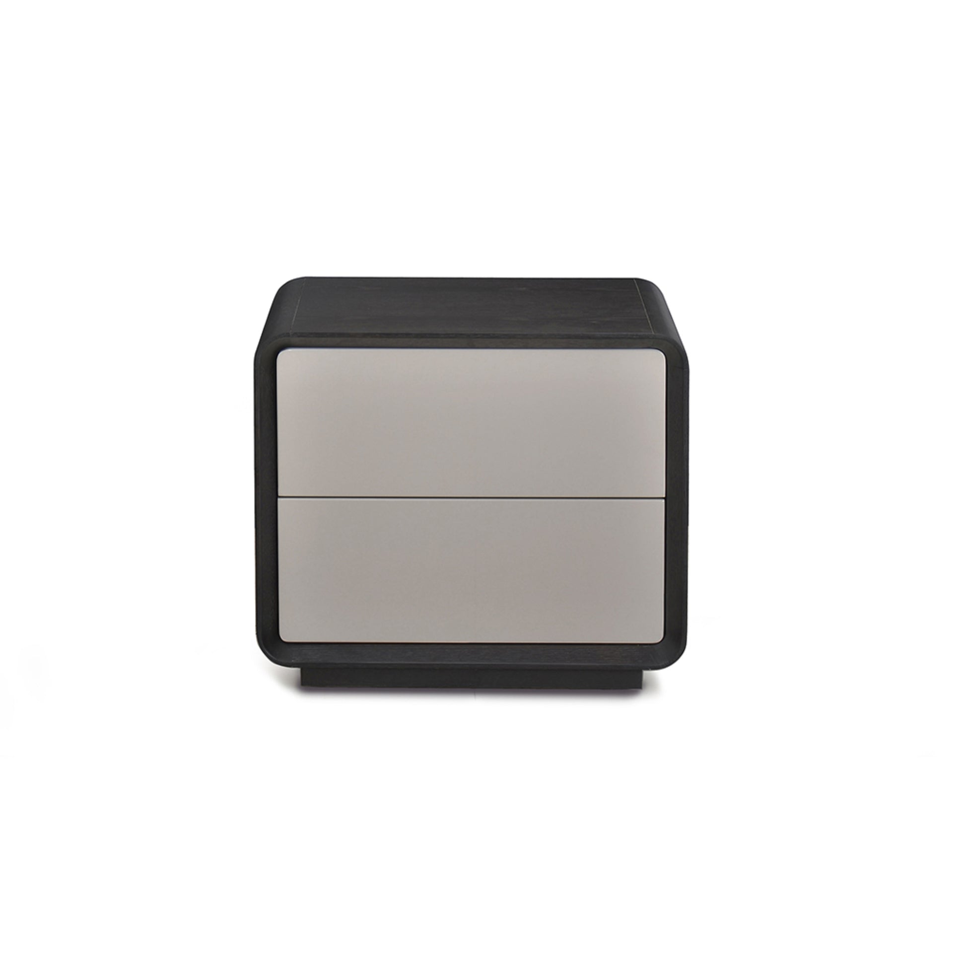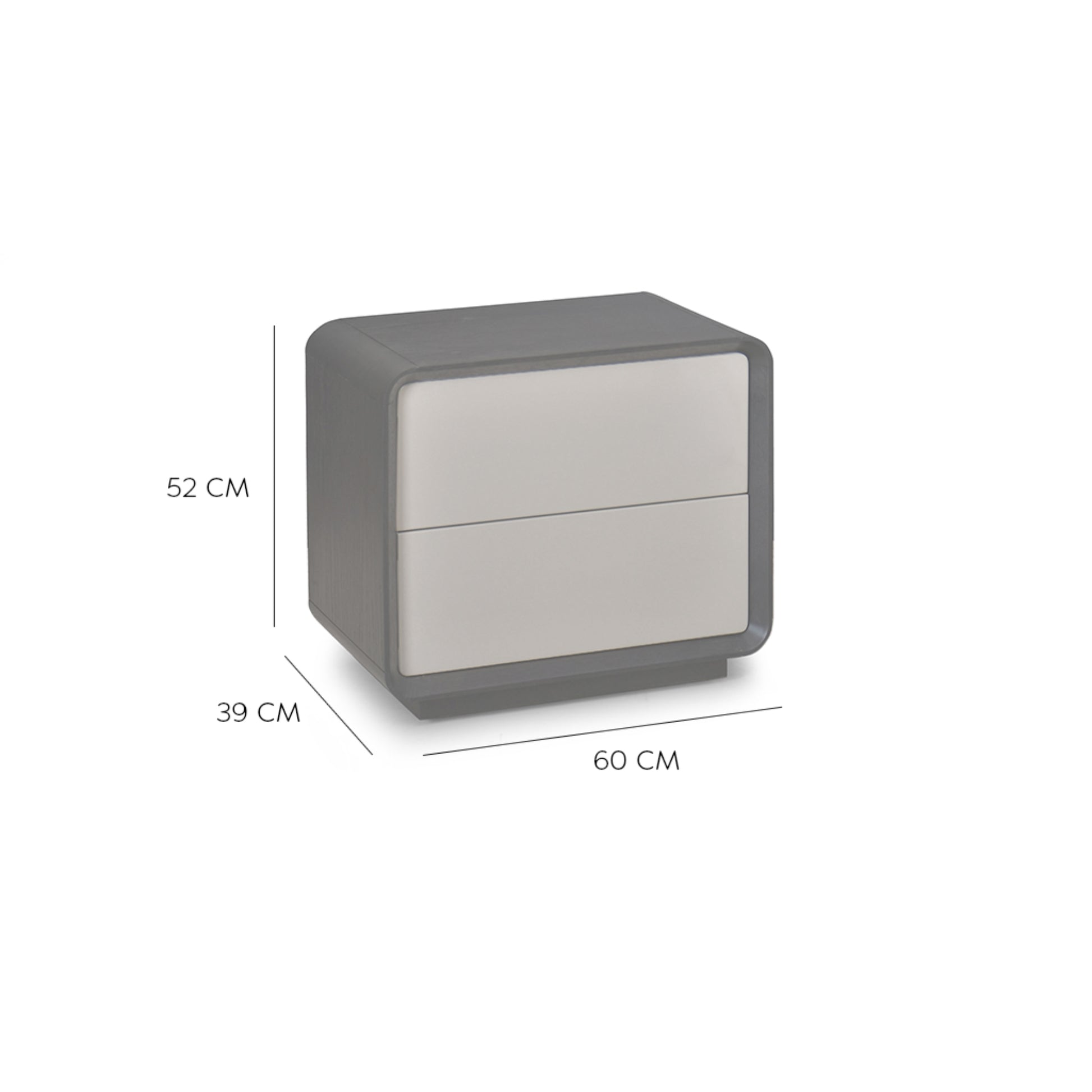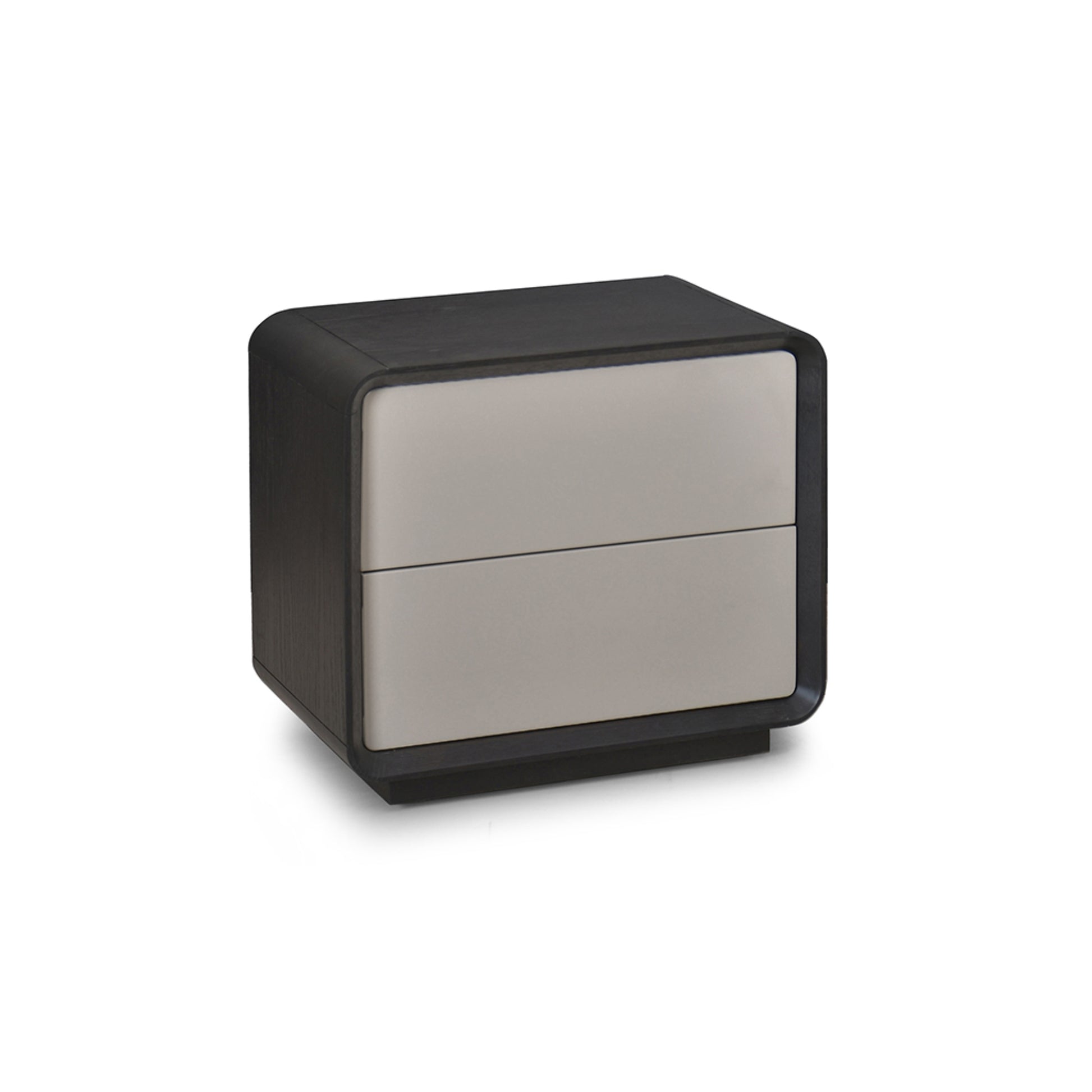 Mesa de noche en madera con bordes curvos y gavetas en greige.