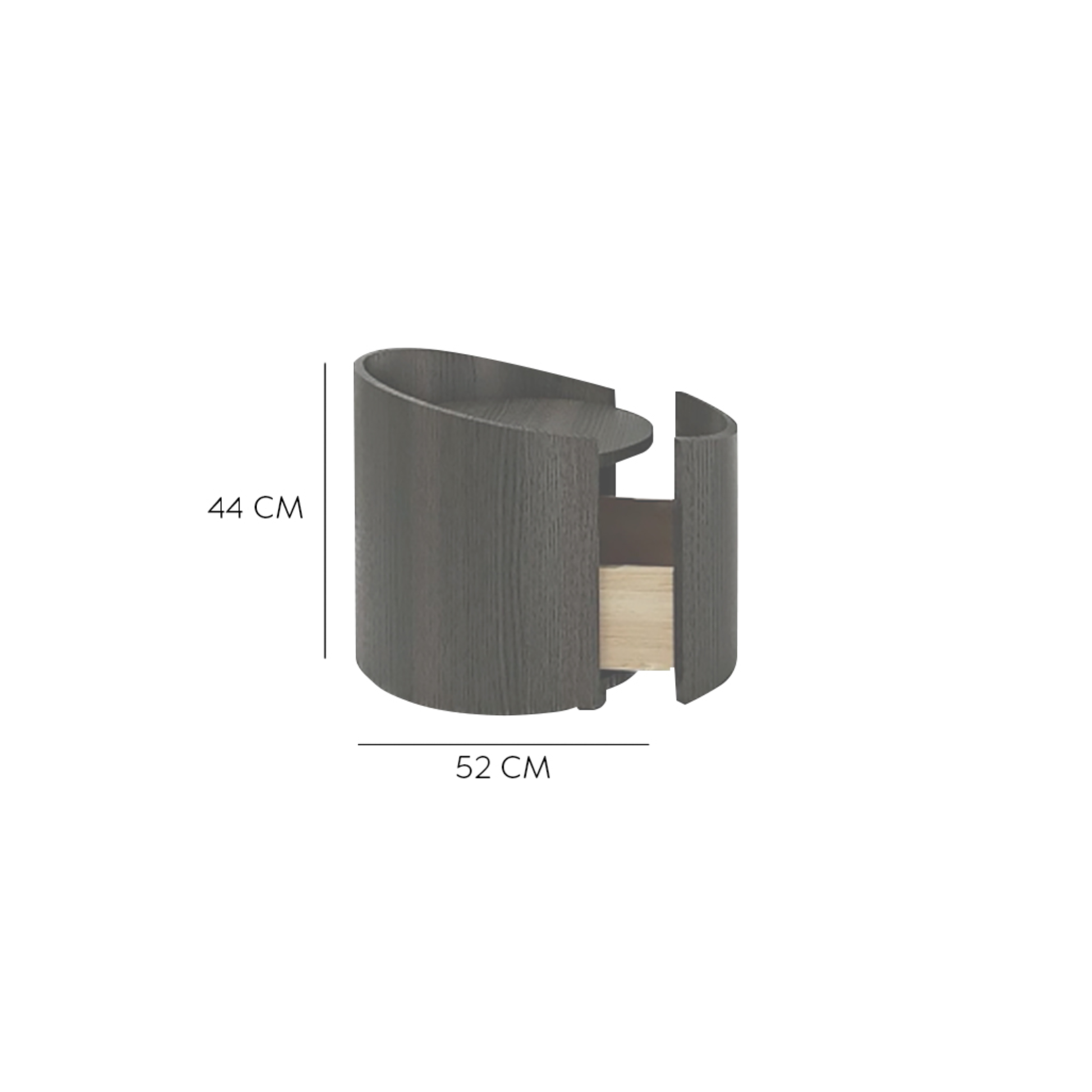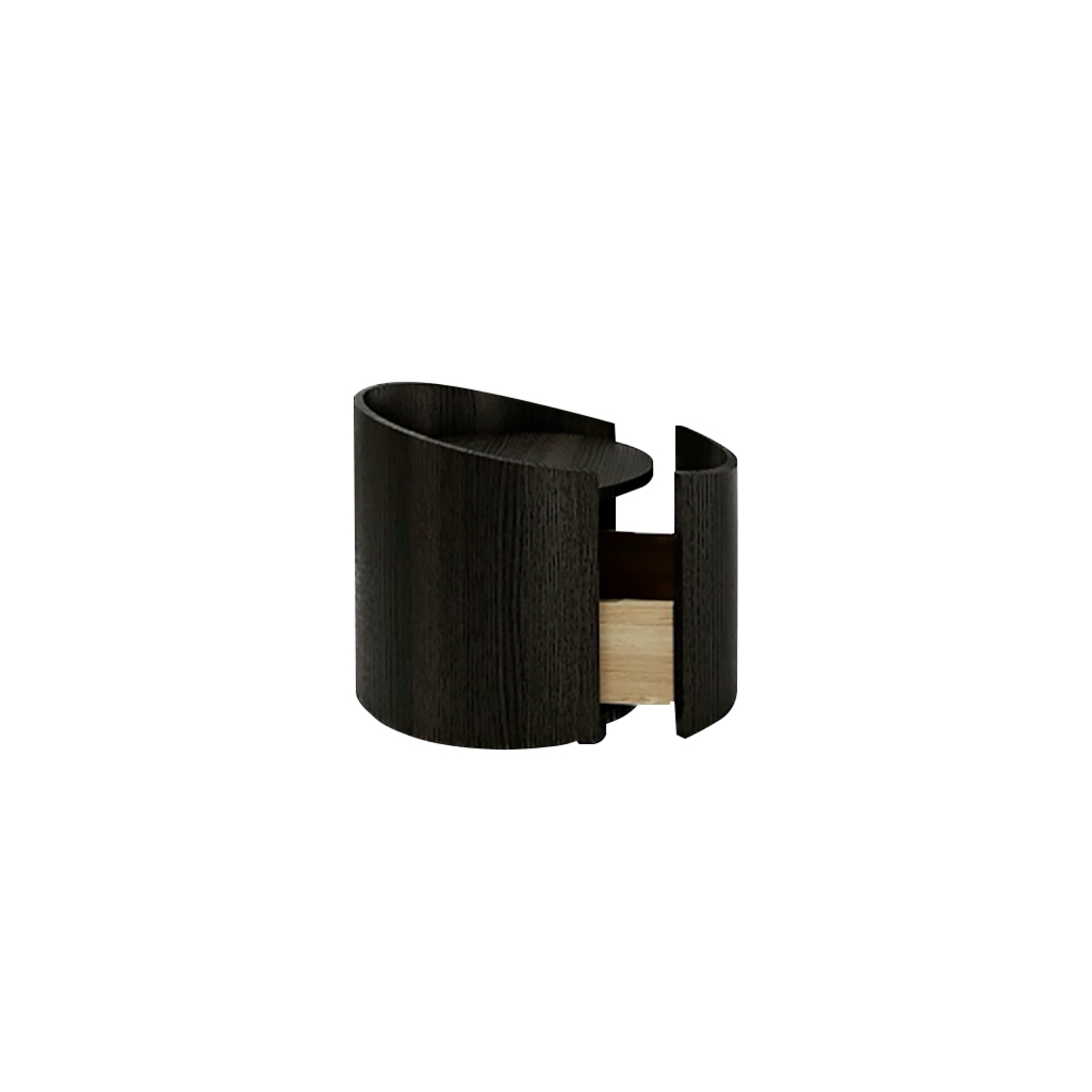 Mesa de noche en madera oscura con forma cilíndrica, posee una gaveta y un tope con bordes sinuosos que la hace lucir elegante.