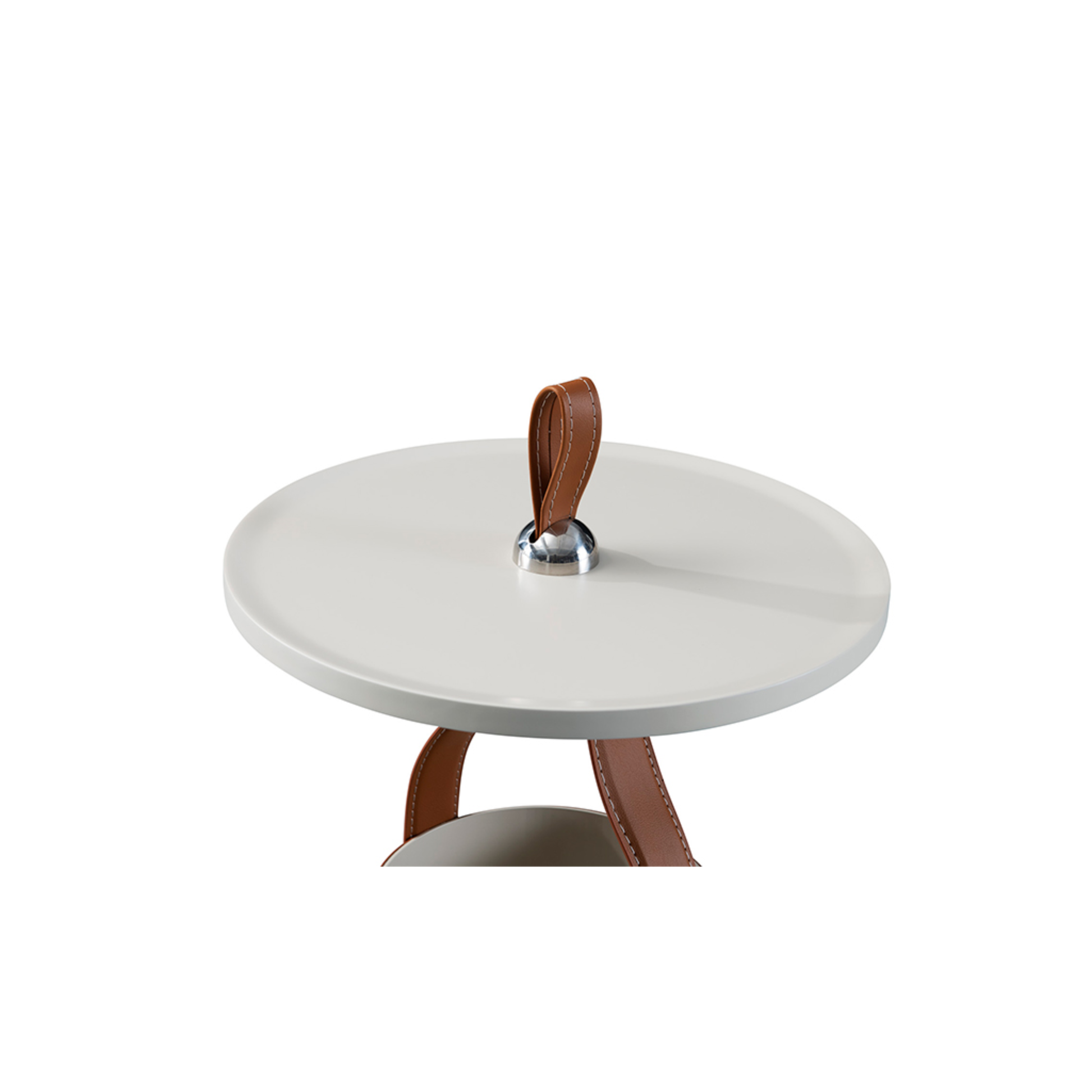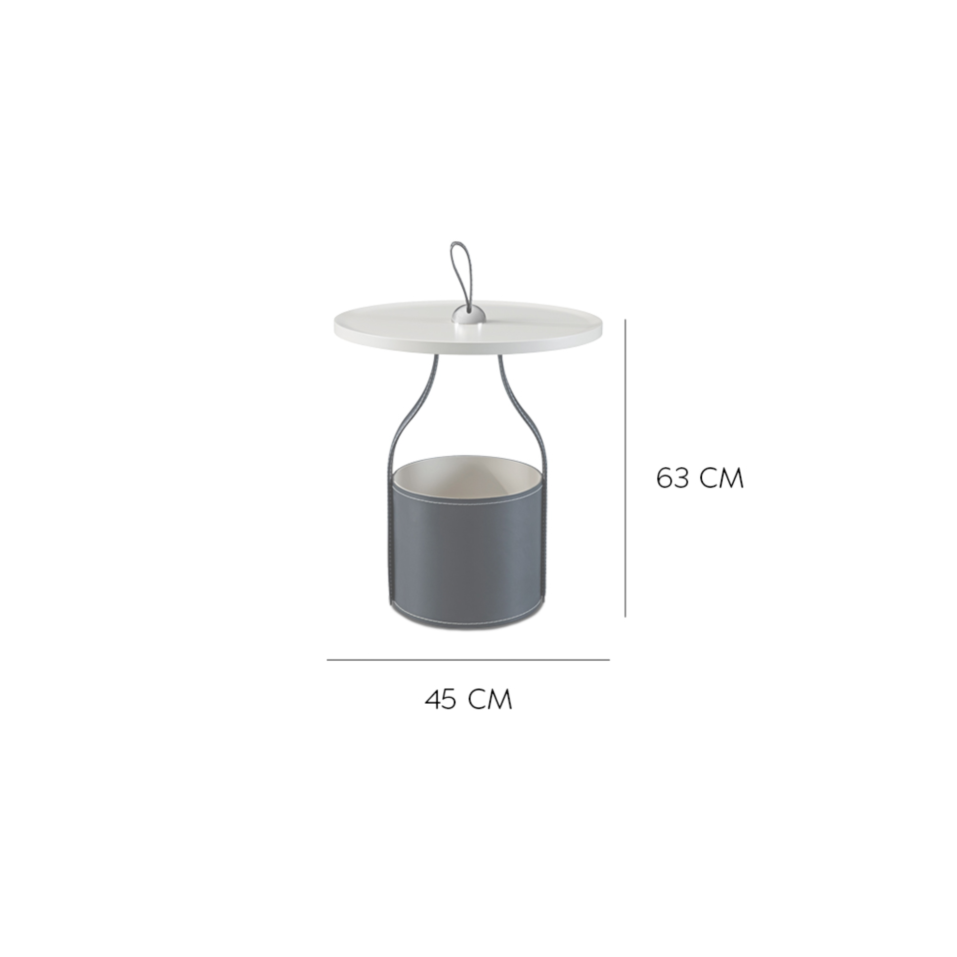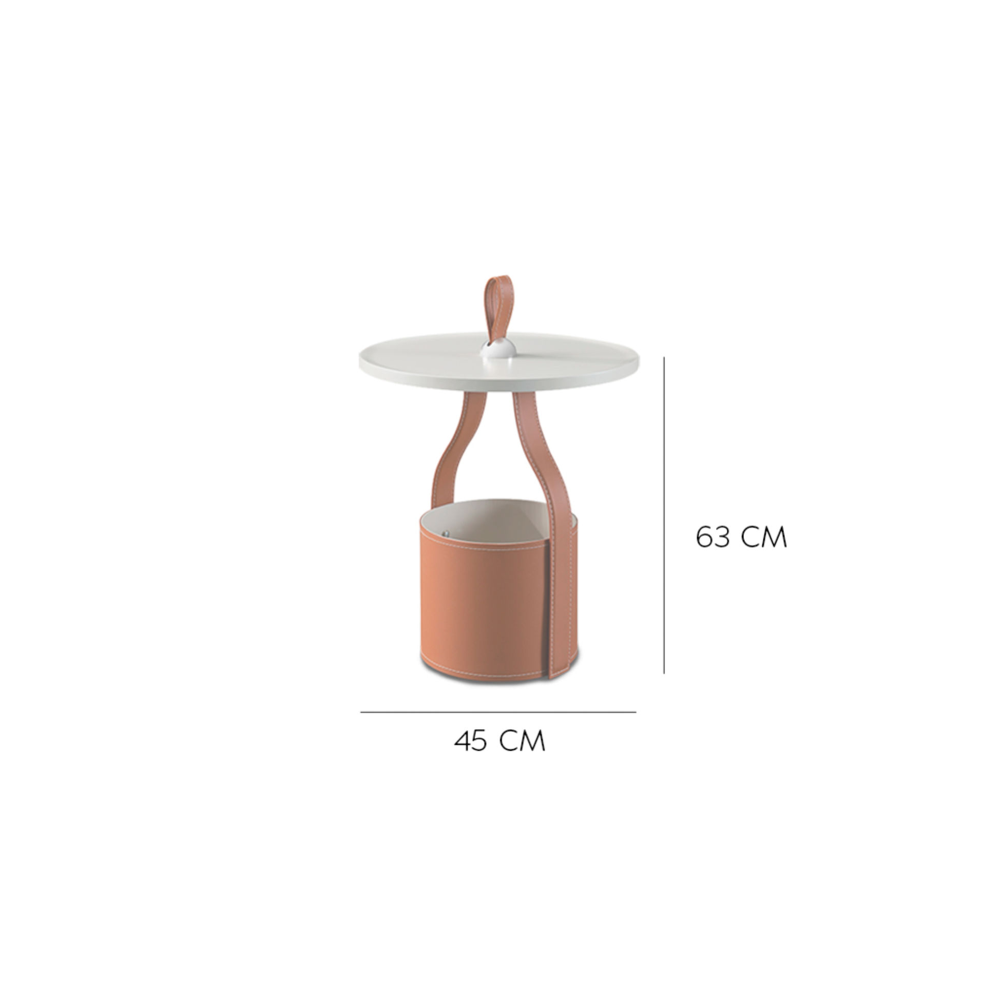 Mesa de apoyo con toque característico de bolsa, su asa destaca en el tope y la parte baja funciona para almacenar artículos.