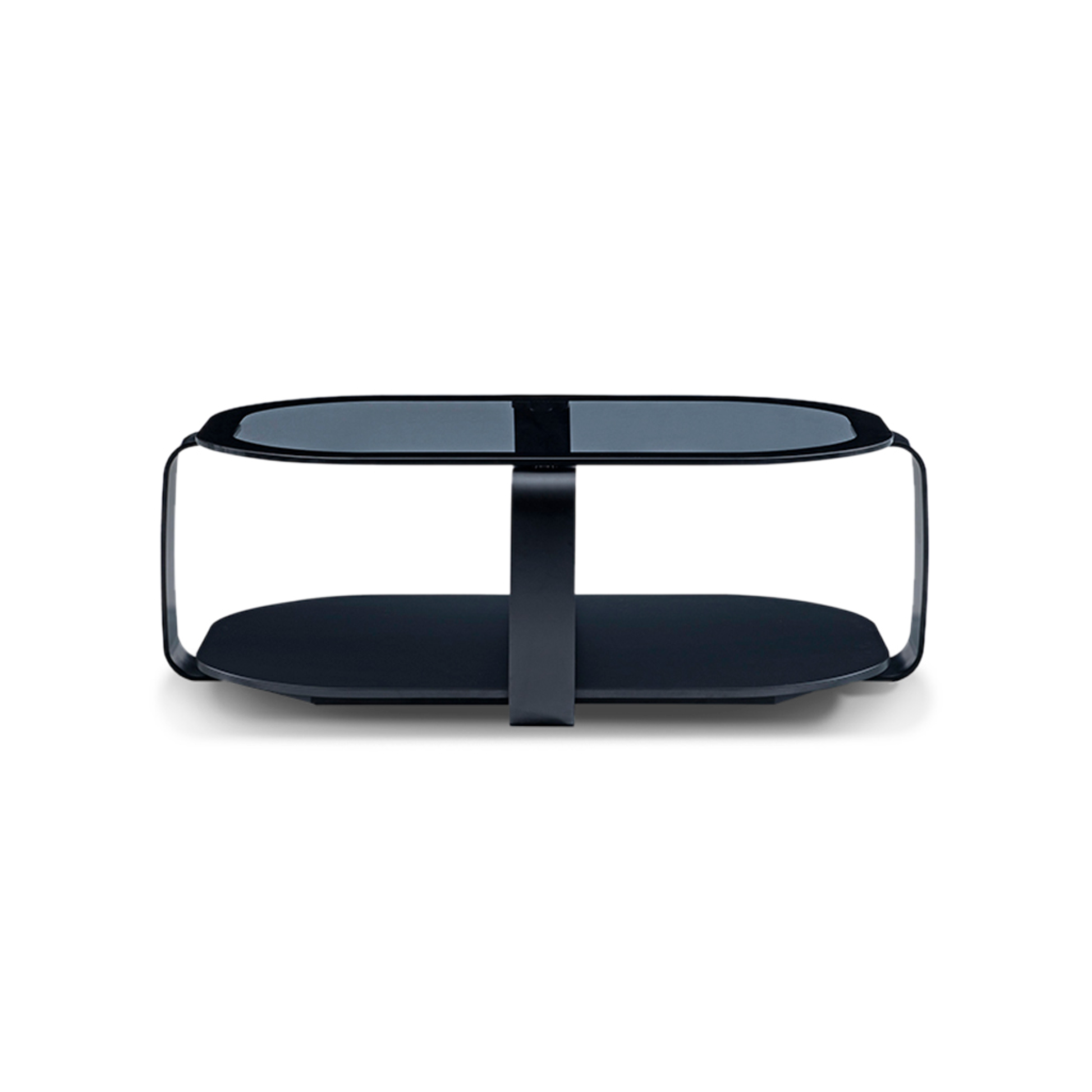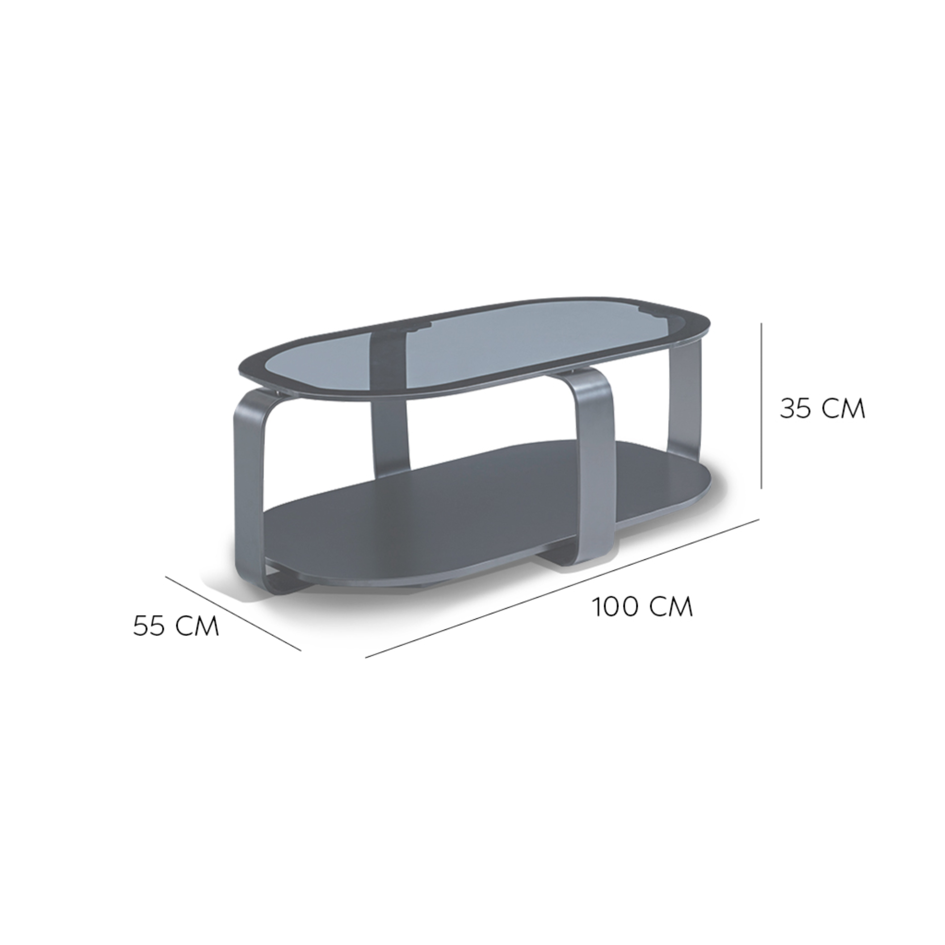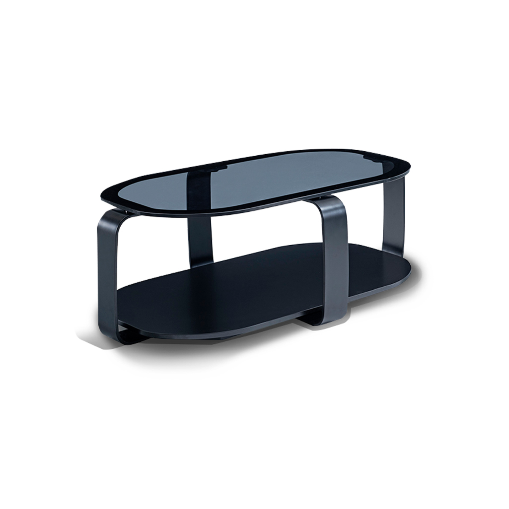 Mesa de centro con tope de vidrio y bordes curvos, en color negro destaca por ser elegante y fácilmente combinable.