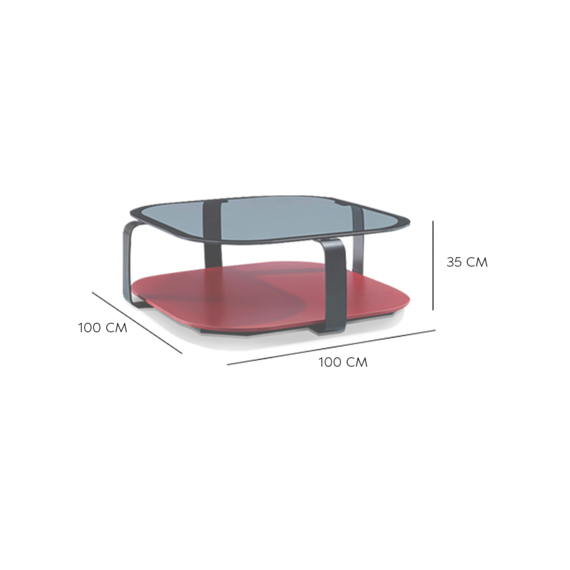 Mesa de centro con tope de vidrio negro y bordes curvos, en color rojo la parte inferior destaca por ser llamativa.