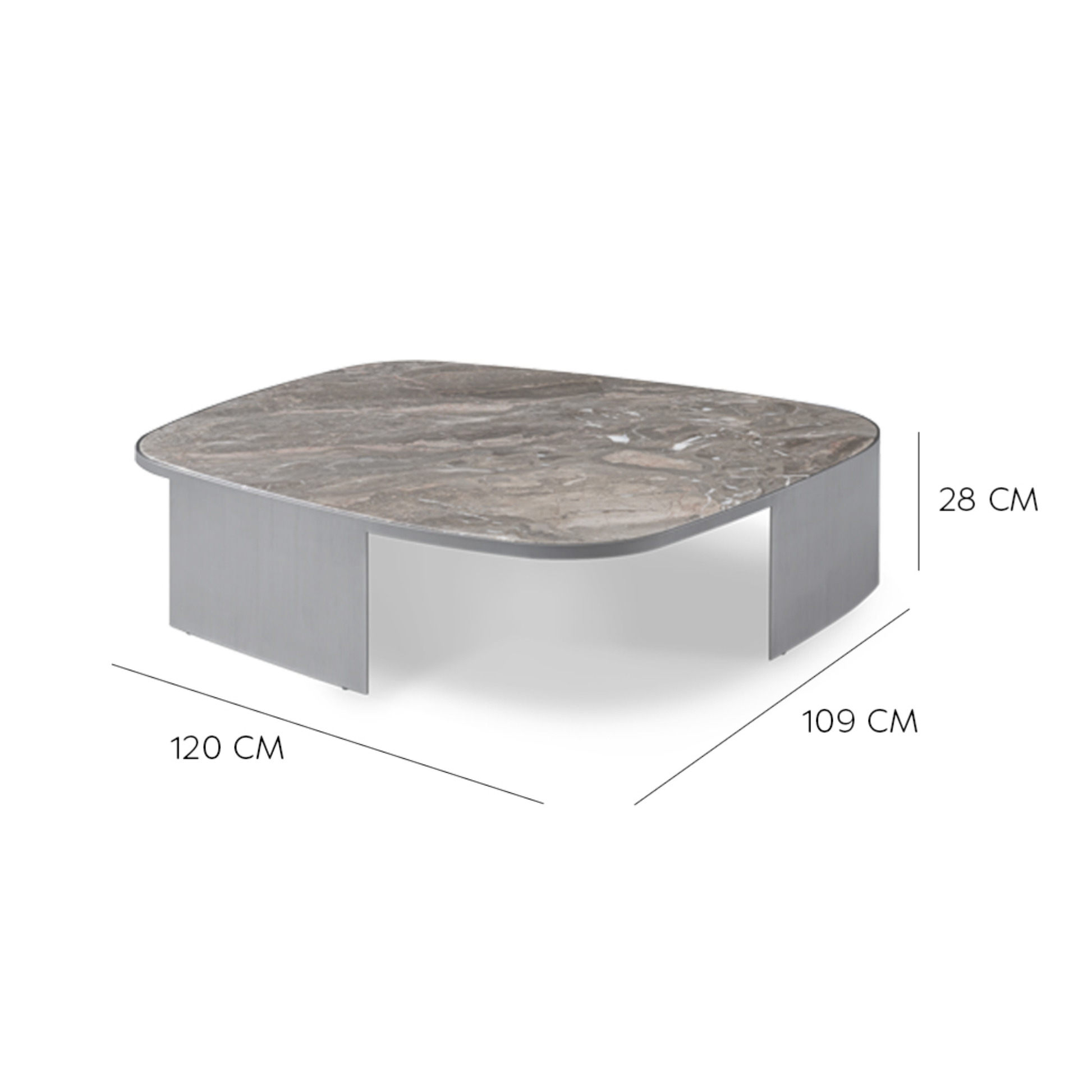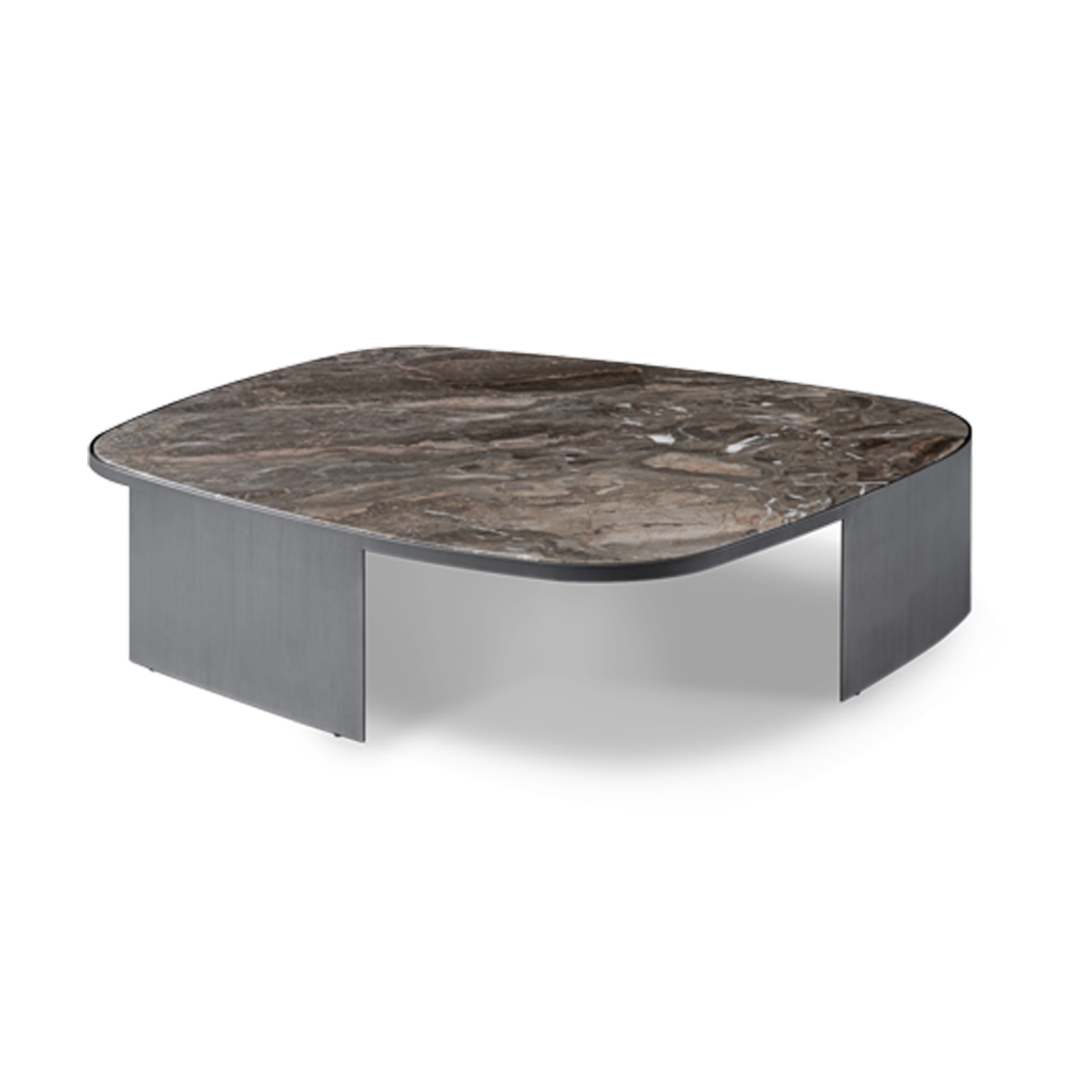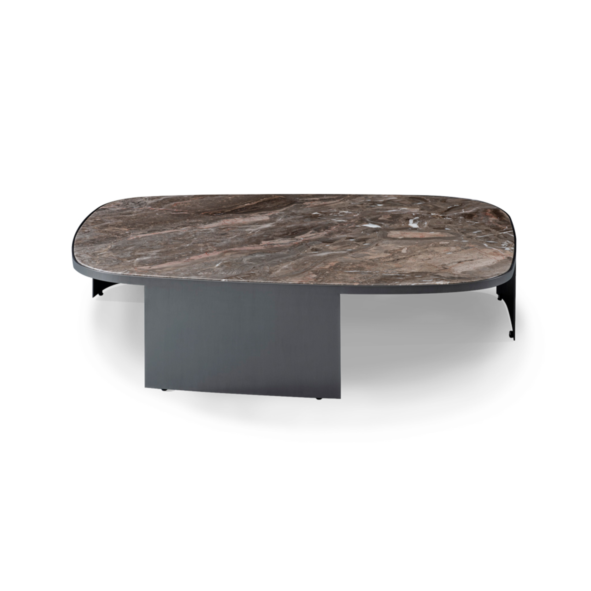 Mesa con bordes curvos, tope de mármol Venice Brown y estructura metálica ultra delgada.