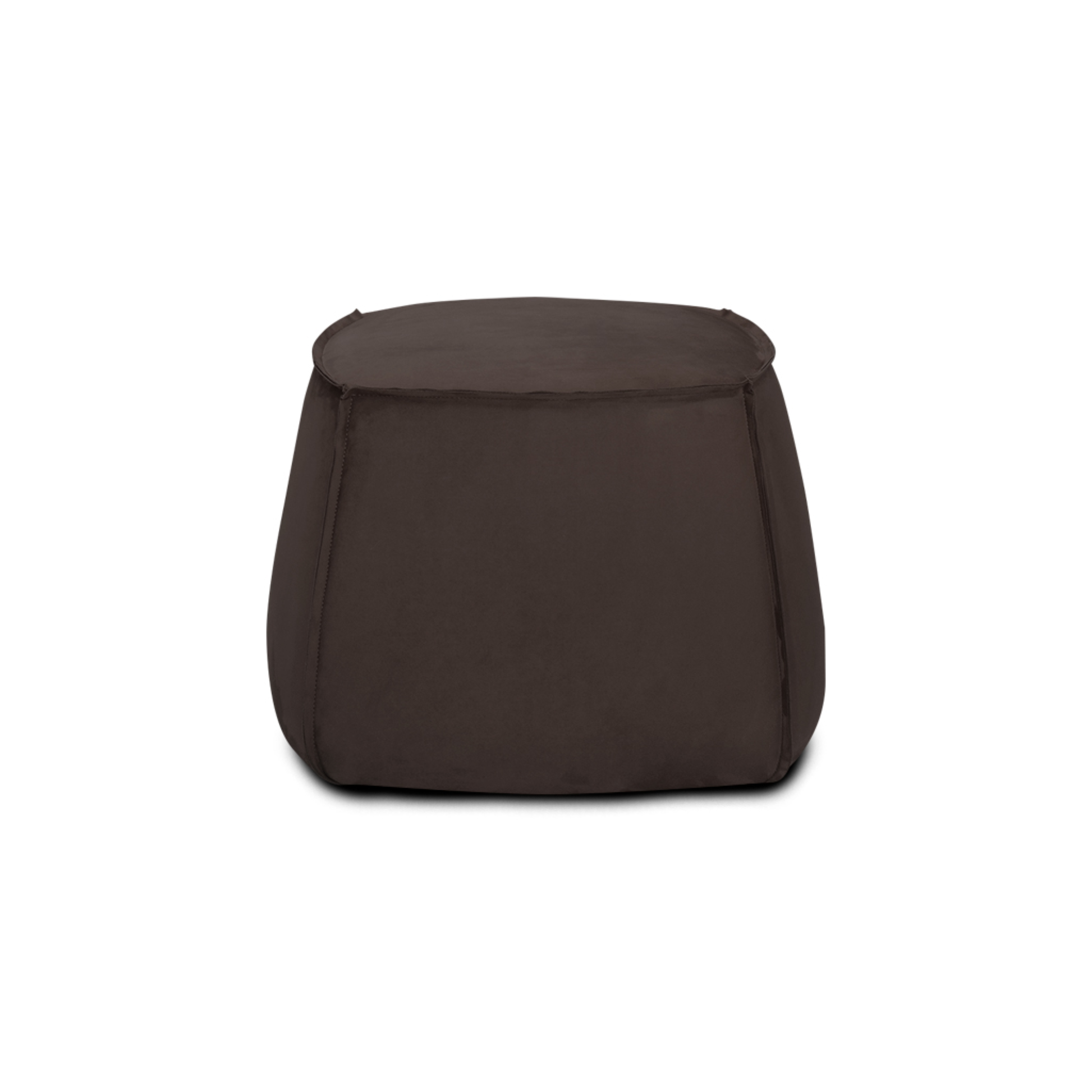 Ottoman de tela con bordes expuestos, en forma de pirámide truncada.
