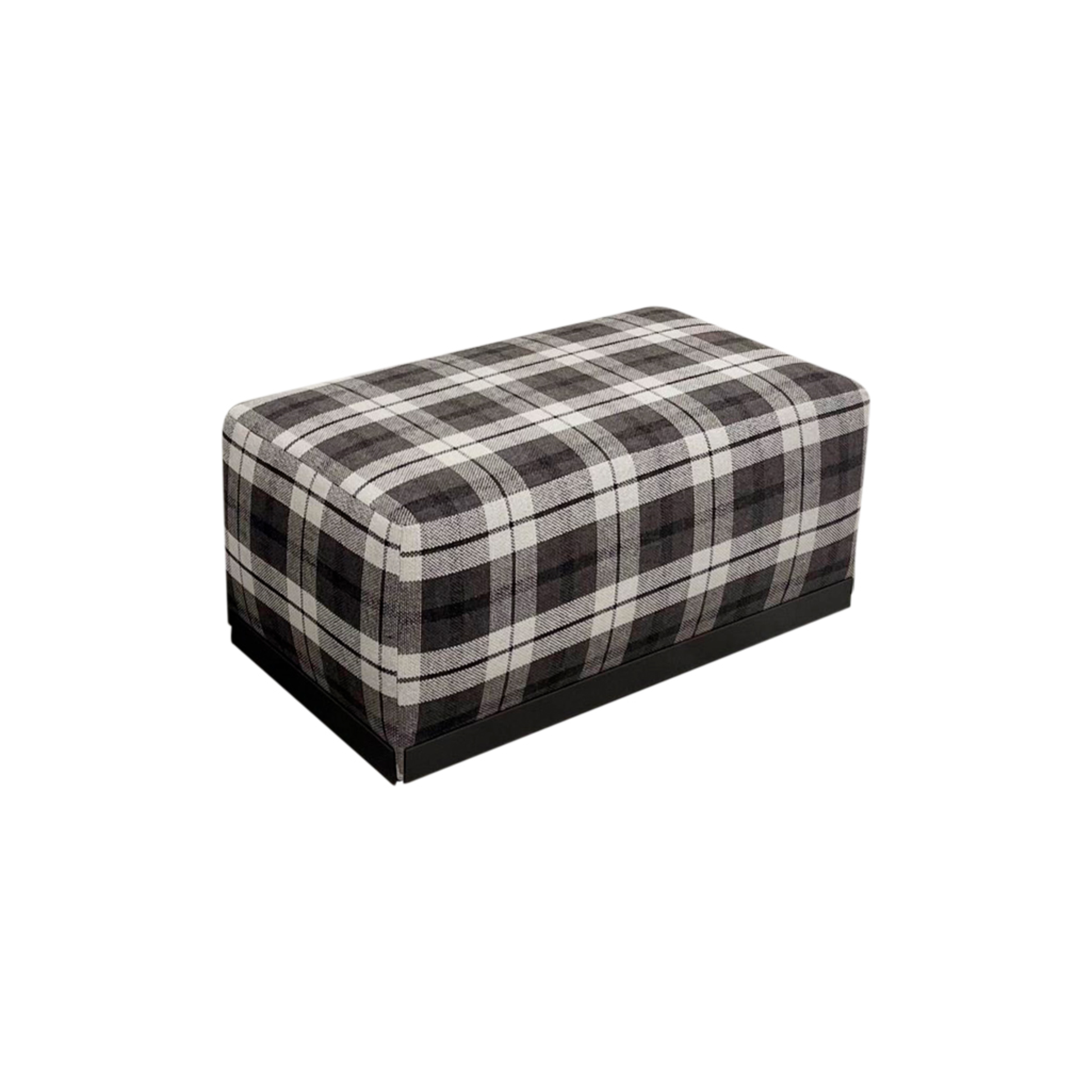 Ottoman de tela con base rectangular y estilo campestre.