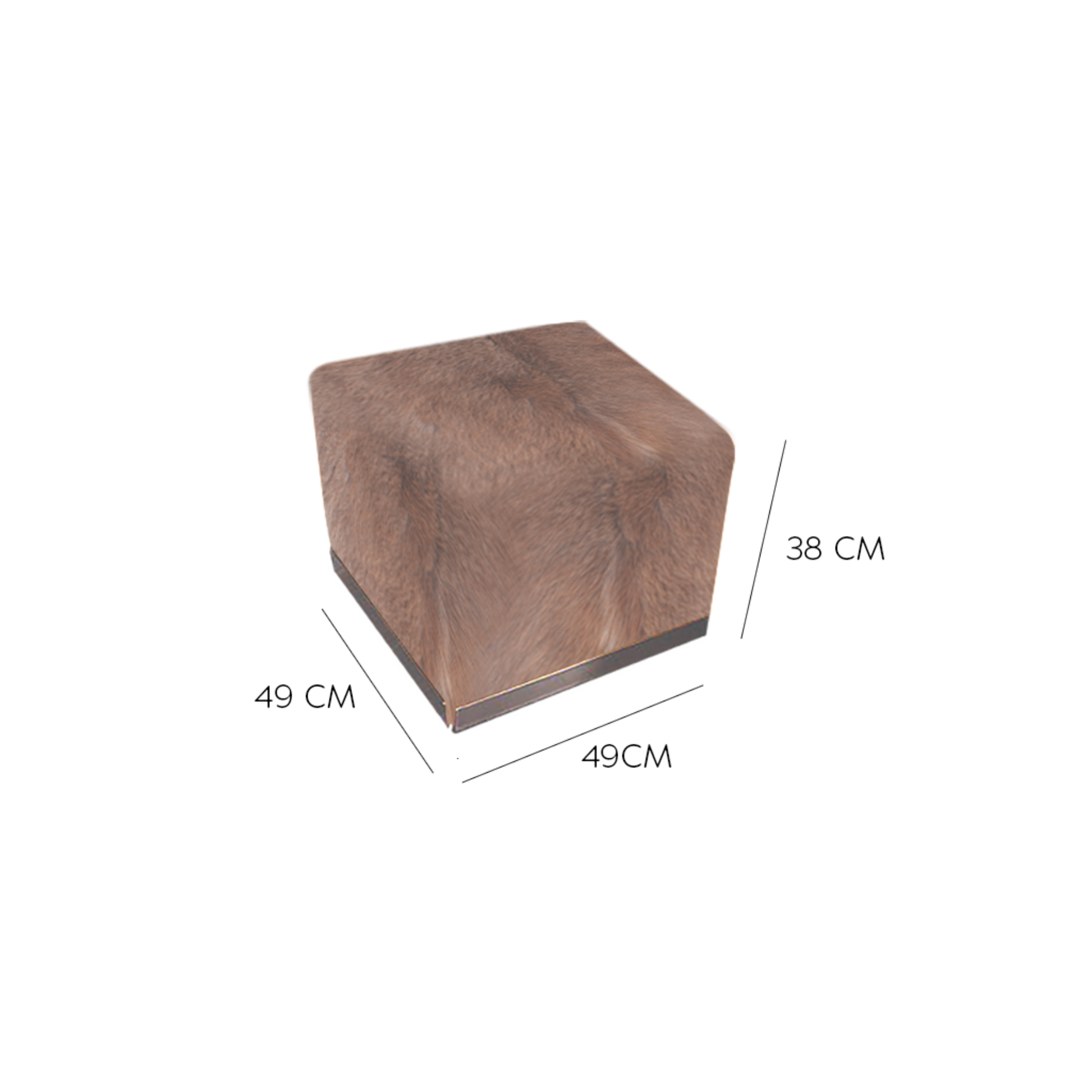 Ottoman en tela de base cuadrada con cuero de caballo en pelo, una pieza única para gustos extrovertidos y amantes de la naturalidad de los materiales.