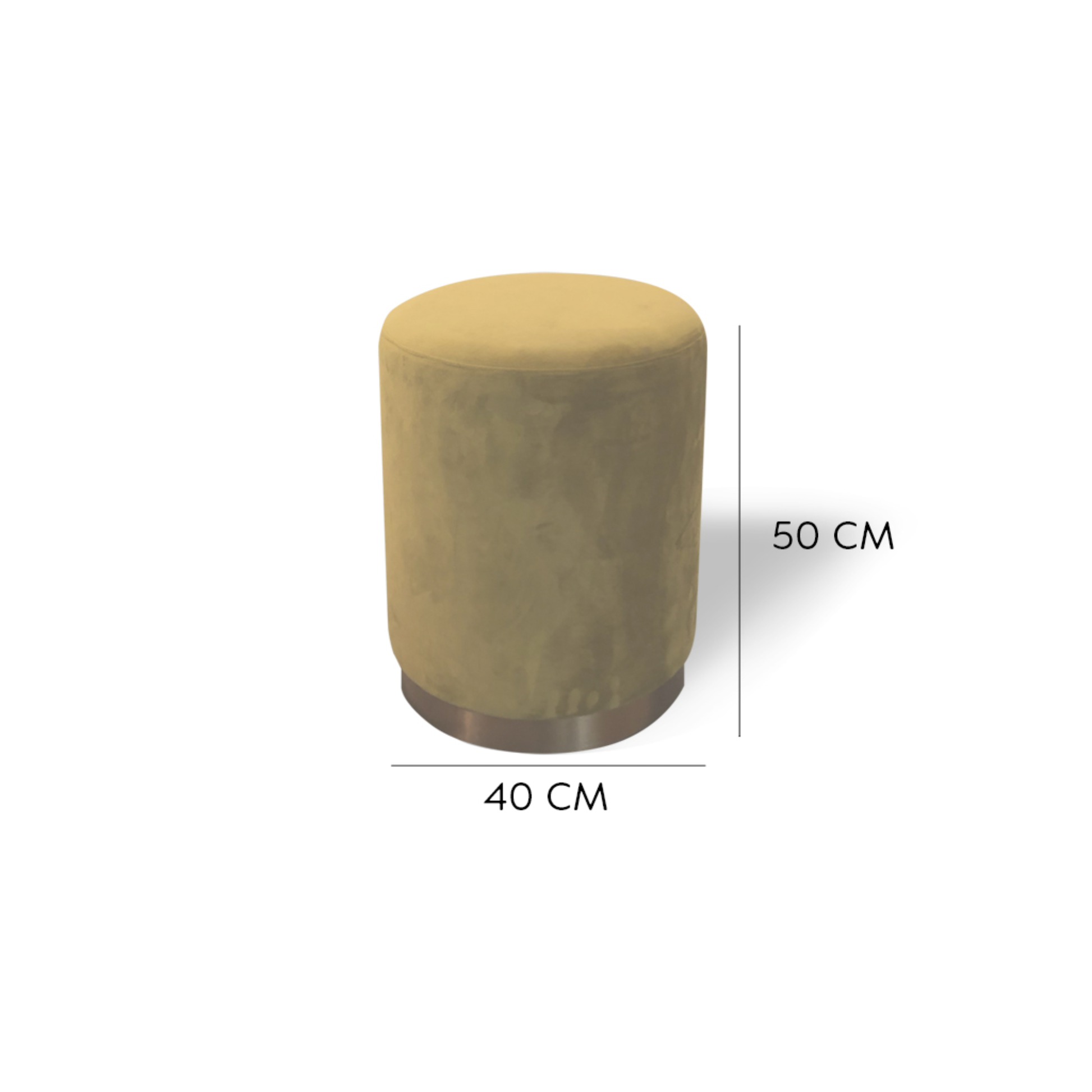Ottoman cilíndrico con base dorada, liviano, amable y sensorial, perfecto para acompañar la sala.