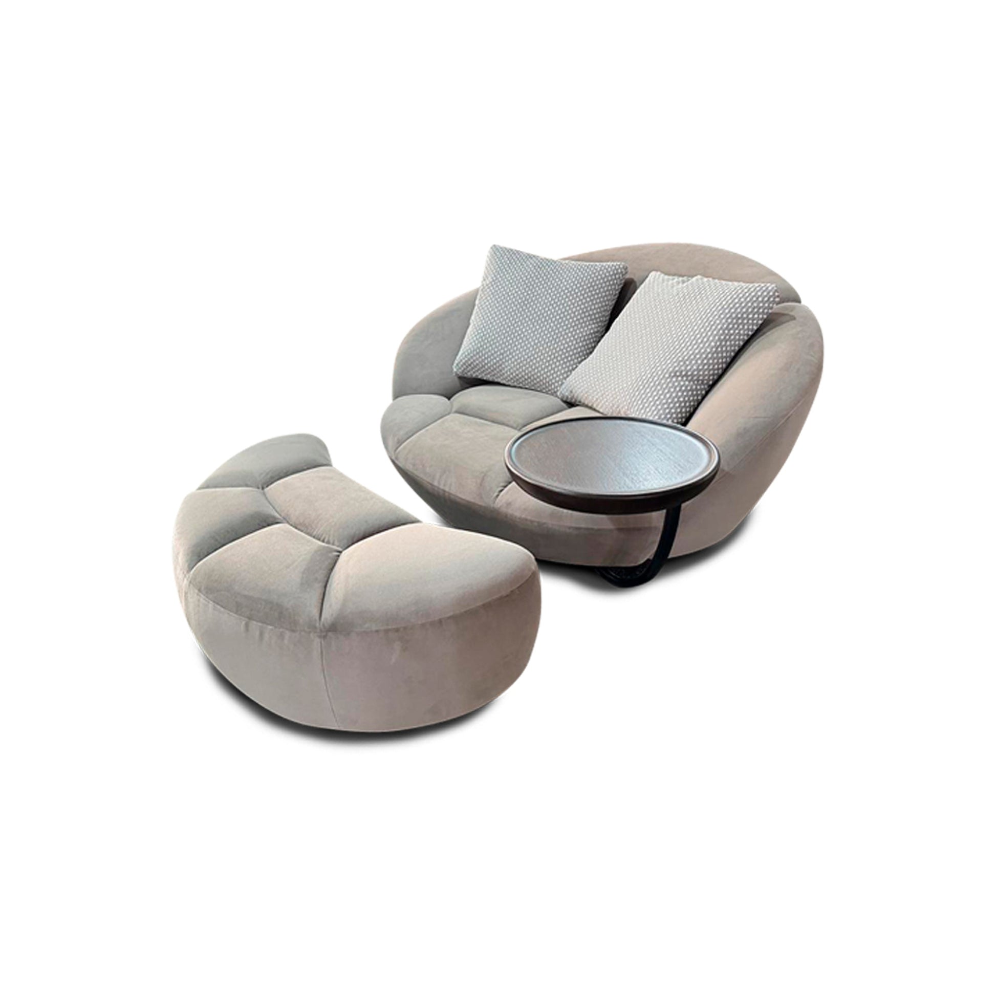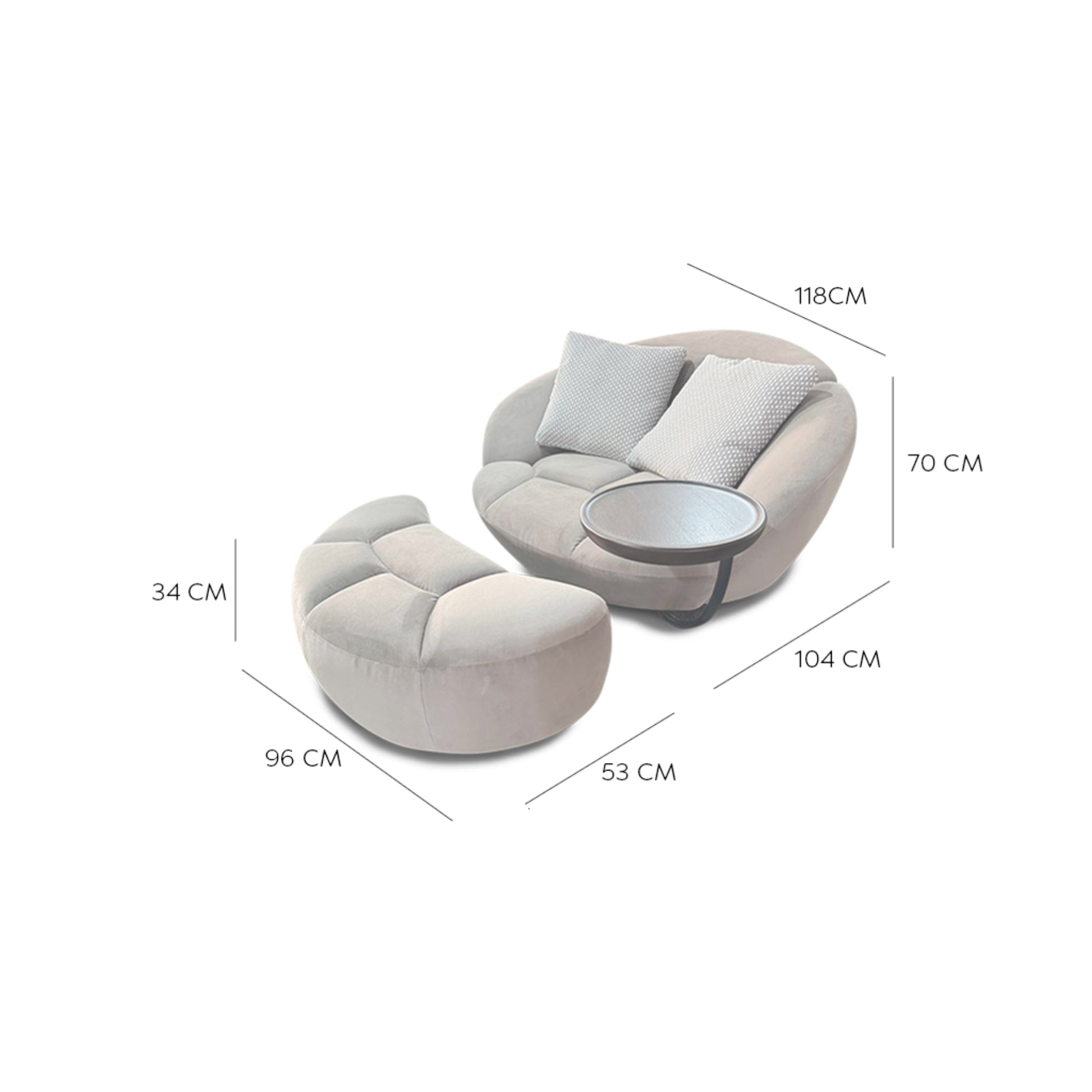 Poltrona estilo sillón nido con mesa de madera y ottoman incorporado, lo cual es excelente para entornos familiares donde puedan reunirse y compartir.